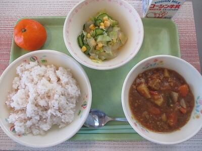 12月9日 ポークカレーライス(麦ご飯・カレールウ) こんにゃく入りサラダ みかん