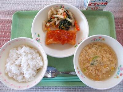 1月15日 牛乳 ご飯 いかのチリソースかけ じゃが芋のごまサラダ 卵と豆腐の中華スープ