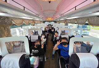 まわりの景色に山が多くなってきました。楽しいバス旅です。