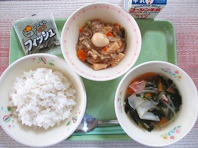 4月23日 牛乳 わかめご飯 厚焼き卵 肉じゃが 豆腐と油揚げの味噌汁 ひとくちみかんゼリー