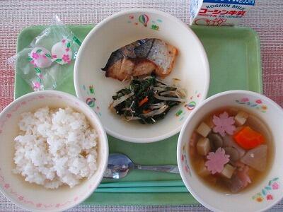 3月5日 牛乳 ご飯 鯖の味噌煮 磯香和え みぞれ汁 いちご(2粒)