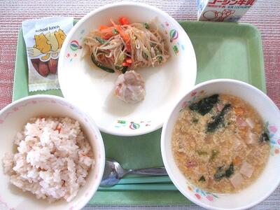 2月4日 牛乳 中華風炊き込みご飯 ポークシュウマイ バンサンスウ 中華卵コーンスープ スナックアーモンド