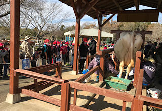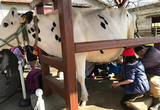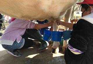 まず、指でOKのマークを作り、牛の乳の根元にあてます。次に中指から順番に指をおろしながら握ると牛乳が出てきます。練習しているところです。