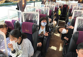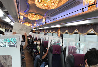 バスの中はレクで盛り上がっています。文字バラバラクイズです。レク係がとても頑張っています。日光クイズも出題され、学習を深めています。