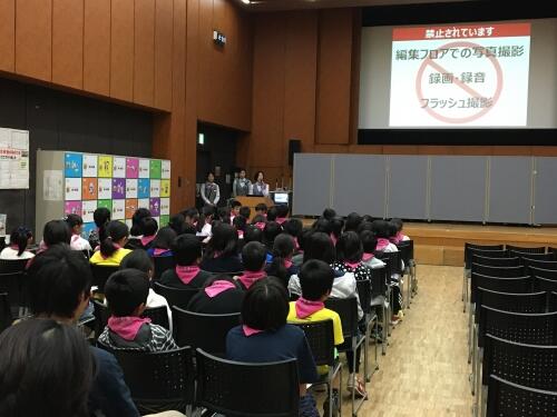 朝日新聞東京本社に着きました。まず、クラスごとに記念撮影を行いました。
