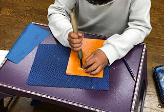 さあ、日光彫に挑戦。独特の引っかき刀の使い方を教えていただきます。