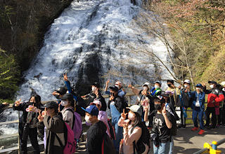 いよいよ華厳の滝にやってきました。毎秒およそ1トンの水が落差97メートルの岩を一気に流れています。。音も水しぶき、そしてマイナスイオンもたっぷりで、迫力満点です。