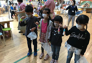 まず、子ども美術館で、キャンドル作り体験をします。子ども美術館の前でグループ写真を撮りました。