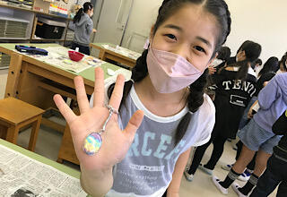 世界に一つの作品。キーホルダーにつけて完成です。おみやげに持って帰ります。