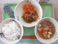 今日の給食は牛乳、ごはん、味付けのり、鶏肉の唐揚げ、ピーマンの味噌金平、豚汁です。