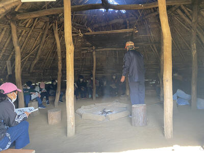 加曽利貝塚に到着しました。実行委員司会のもと、職員の方のお話をお聞きしています。