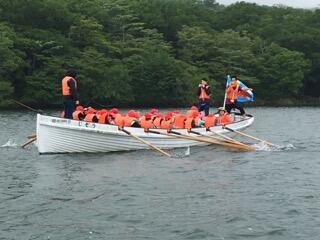 みんなで力を合わせて掛け声をかけて漕ぎます。引いて、戻して、引いて、戻して。スイスイ進みます。