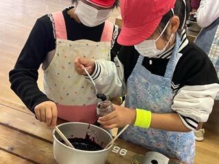 ブルーベリーを潰して砂糖を加え、火をつけてかき混ぜています。