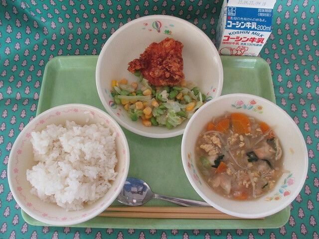 9月12日 牛乳 ご飯 鶏肉の唐揚げ 枝豆ととうもろこしの甘酢和え 卵入りおふとかんぴょうの味噌汁
