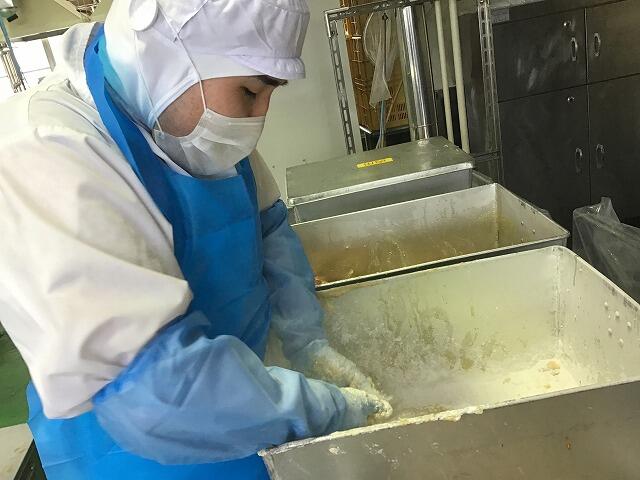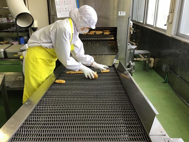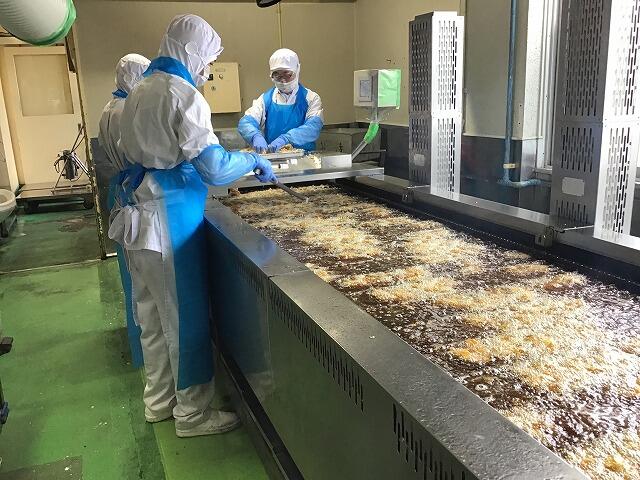 味と衣をつける人 揚げる人くっつかないようにはがす人