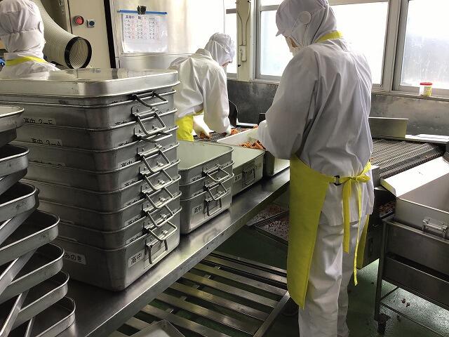 唐揚げは給食室の手作りです。作ってそれぞれのクラスに入れるために,7~8人がかりで作業しています。