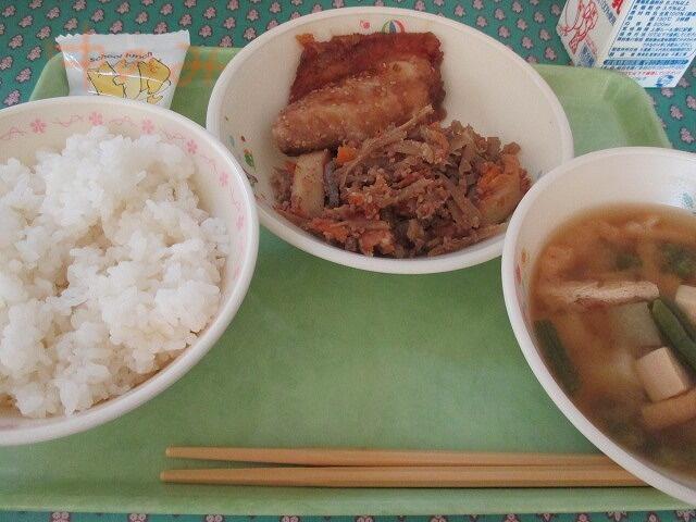 7月10日 牛乳 ご飯 鯖の揚げ煮 五目金平 さやいんげんの味噌汁(中学校のみ黒糖大豆がつきます)