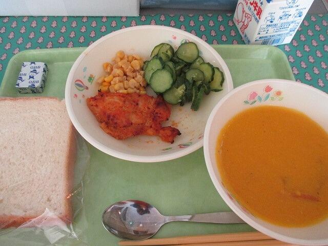 7月11日 牛乳 食パン スパイシーグリルドチキン コーンソテー キューカンバーサラダ パンプキンポタージュ(豆乳・米粉) ベビーチーズ