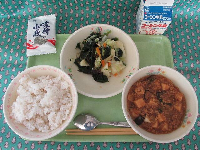 7月12日 牛乳 麦ご飯 麻婆なす 海藻サラダ(青じそドレッシング)味付け小魚