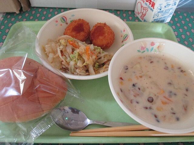 7月13日 牛乳 テーブルロール ささみフライ(2個)ソース キャベツのごま酢和え レンズ豆のクリームスープ