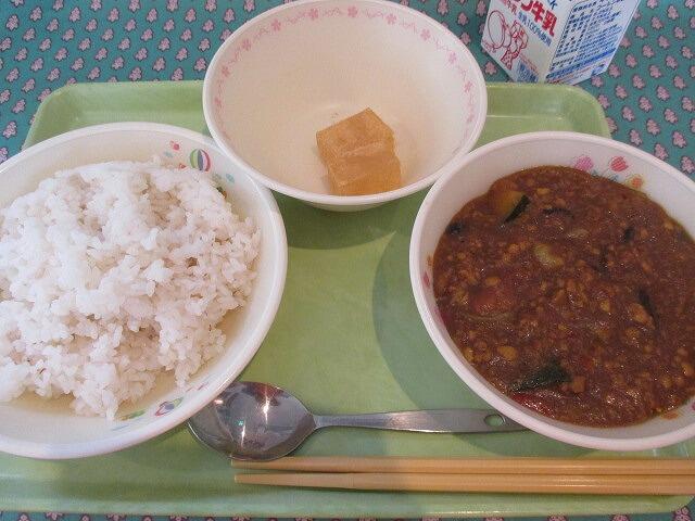 今日は夏野菜がたっぷり入ったカレーです。なすやかぼちゃパプリカが入っています。なすは一度油で揚げています。夏野菜は体の中の熱を冷ましてくれる効果もあるので,食べて少しでも涼しくなればと思います。1学期の給食は今日で最後です。夏休み元気に楽しく過ごせますように・・・。ありがとうございました。