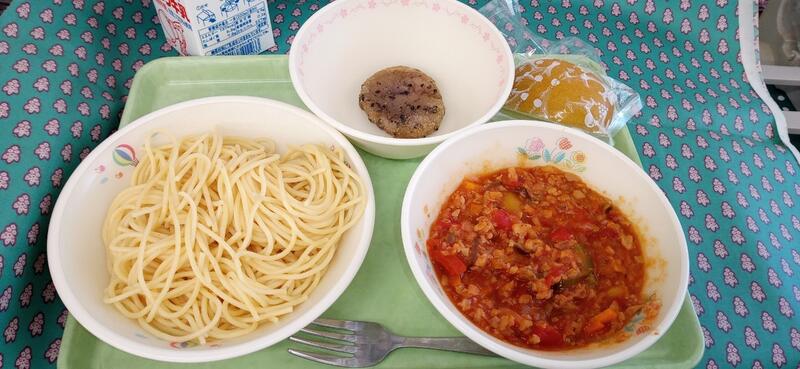 9月5日 牛乳 ツナ入りトマトスパゲッティ(スパゲッティ) 紫芋もち 梨