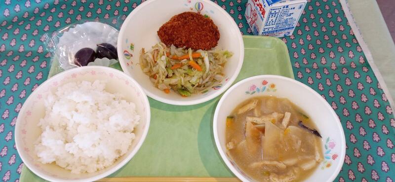 9月6日 牛乳 ご飯 ソースかつ キャベツの昆布和え ひんのべ(具だくさんみそ汁) 巨峰