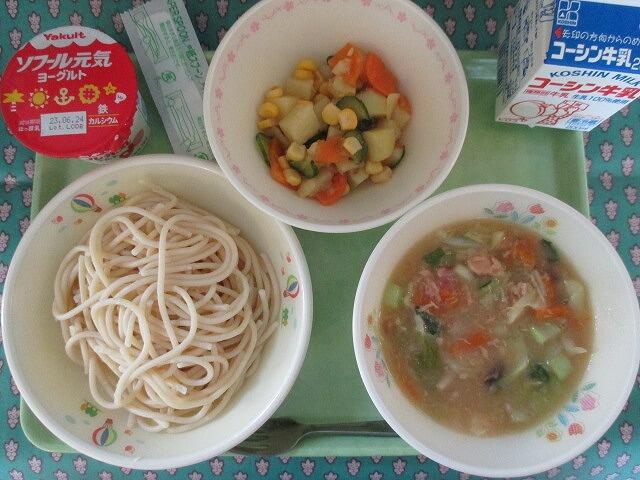 6月9日 牛乳 ツナと江戸菜の和風スパゲティ 味噌ドレッシングサラダ ヨーグルト