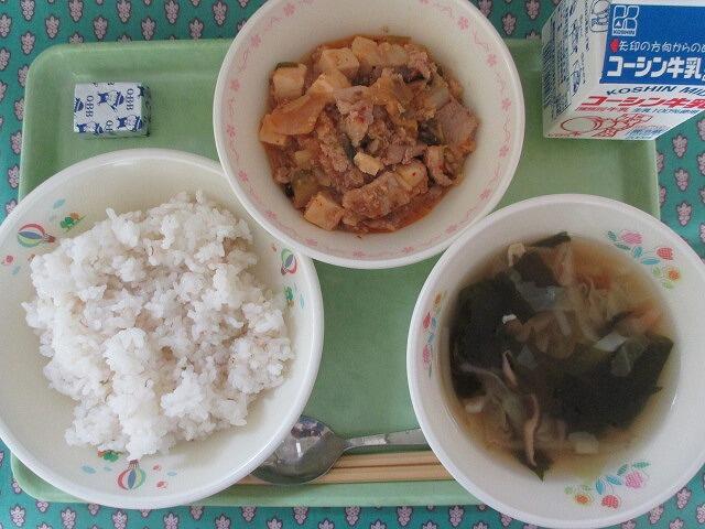 6月13日 牛乳 チゲ豆腐丼(麦ご飯・チゲ豆腐丼の具) タッケジャンスープ ベビーチーズ