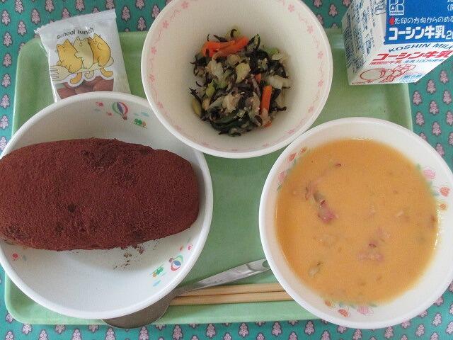 6月14日 牛乳 ココア揚げパン キャロットポタージュ ひじきと青大豆のサラダ スナックアーモンド