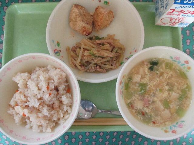 6月19日 牛乳 中華風炊き込みご飯 豚肉と野菜のオイスター炒め あべかわさつま芋(2個) 中華卵コーンスープ