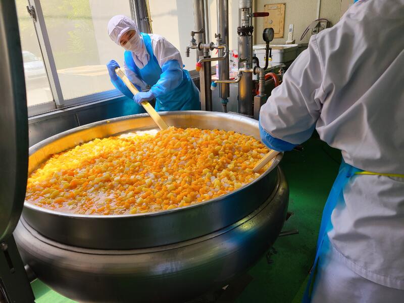 チゲ豆腐丼の「チゲ」は,「鍋料理」という意味があります。豆腐や肉・野菜・キムチなどを入れて味噌味にしました。今日は大きな鍋(釜)3つを使って,2回に分けて作っています。暑い日に辛い物を食べて汗をかいて元気に過ごしてください。チゲ豆腐丼を食べた後は,スープやチーズ・牛乳で辛みをとってくださいね。
