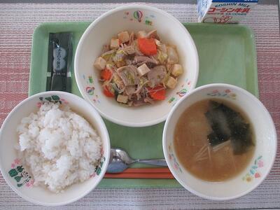 2月6日 牛乳 ご飯 のりの佃煮 肉豆腐 じゃがいもとわかめの味噌汁