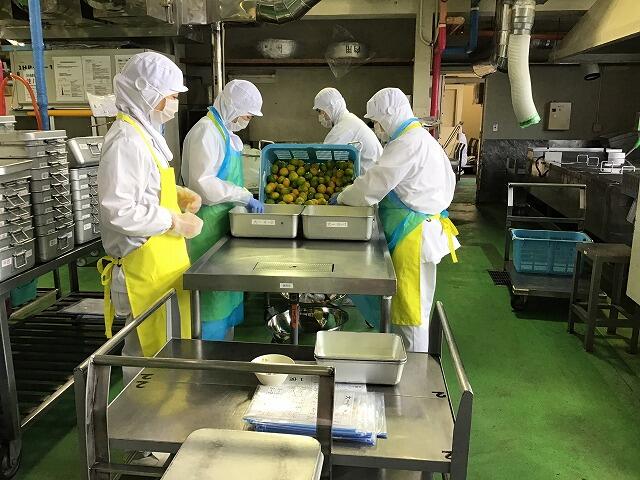 今日は4500個くらいのみかんを1つずつ丁寧に洗ってから各クラスに配っています。