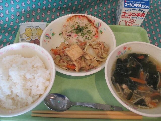 7月3日 牛乳 ご飯 たこ入りすり身焼き 生揚げとキャベツの味噌炒め わかめの吸い物 スナックアーモンド