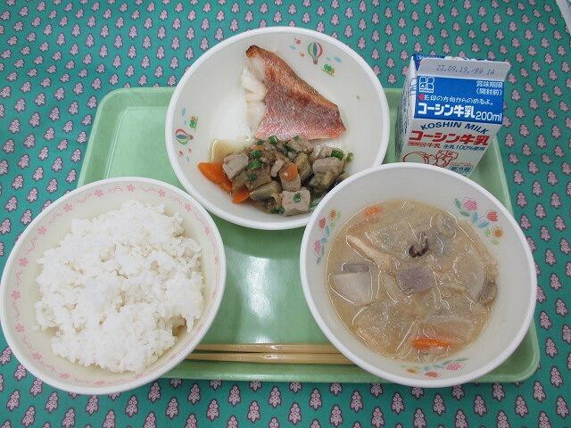 9月8日 牛乳 ご飯 赤魚の割烹焼き 揚げなすと高野豆腐の煮びたし 呉汁 (中学校のみベビーチーズ)