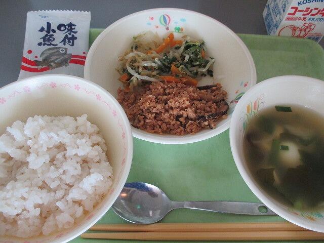 9月7日 牛乳 麦ご飯 ビビンバ(肉・野菜) うずら卵とにらのスープ 味付け小魚