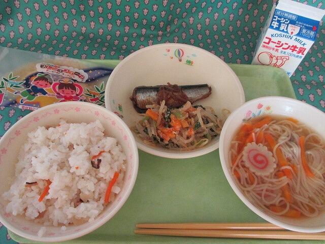 今日は七夕にちなんだメニューをだしました。そうめん汁のそうめんは天の川に見立てて入っています。鰯の生姜煮は、骨までやわらかくなっているので,丸ごと食べられます。今日は天気がいいので,空の上でも織姫と彦星が出会えそうですね。皆さんの願いもかないますように。