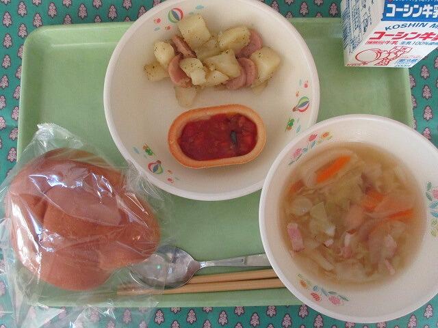 6月7日 牛乳 テーブルロール なすとトマトの丸ごとグラタン バジルポテト キャベツとベーコンのスープ