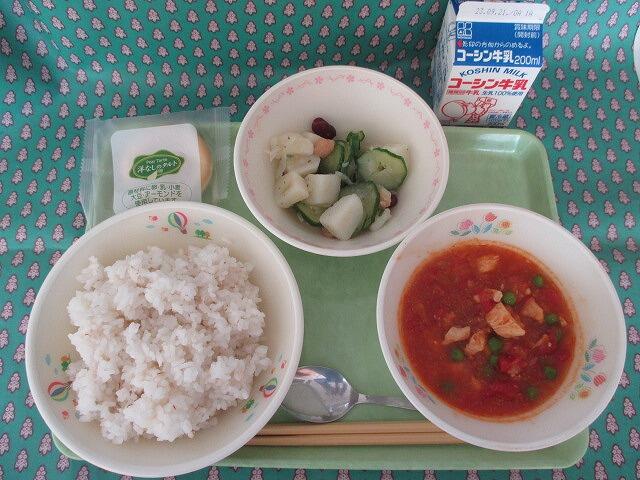 9月11日 牛乳 麦ご飯 鶏肉と野菜のトマト煮込み 三種豆のサラダ 洋梨タルト