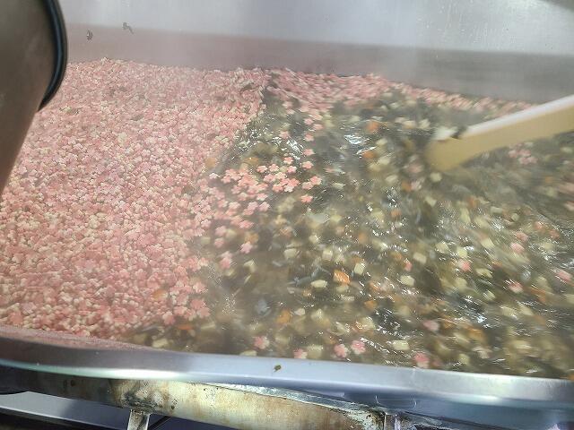 今日はすまし汁の中に,花の形をした「ふ」が入っています。花ふを入れた時の写真を載せます。赤魚は皮の赤い魚のことで,今日は「めぬけ」という魚です。西京焼きは,西京みそという種類の味噌を使っています。これは,発酵期間が短く,米麴の量が多いので,他の味噌より甘くて塩分が少ないのが特徴です。魚を西京みそに漬けることで,保存することができます。昔の人はこのように工夫して食べていたそうです。