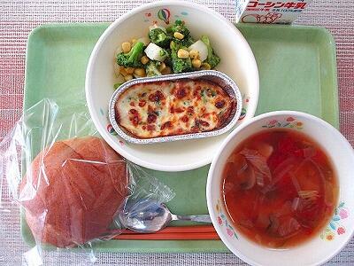 3月12日 牛乳 胚芽パン 菜の花グラタン ブロッコリーとじゃが芋のサラダ ラビオリ入りトマトスープ