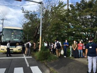今回は3蜜を避ける対策として、バス3台で行きます。目的地は日光です。見送り、ありがとうございます。