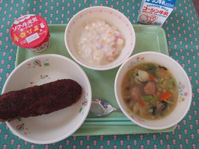 2月27日 牛乳 ココア揚げパン じゃがいものチーズ煮 肉団子と野菜のスープ ヨーグルト