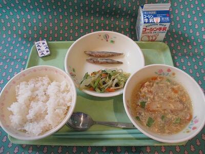 5月20日 牛乳 ご飯 きびなごの唐揚げ(2本) 春キャベツの昆布和え 豚肉とごぼうの卵とじ汁 ベビーチーズ