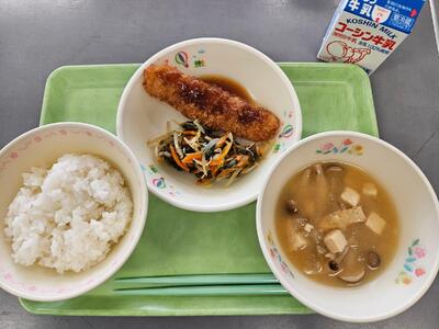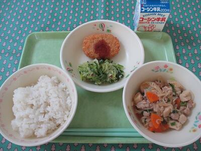 5月24日 牛乳 ご飯 鰹コロッケ(ソース) きゅうりの梅肉和え 鶏肉と高野豆腐の含め煮