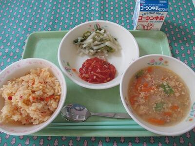5月29日 牛乳 キャロットピラフ 鶏肉のトマトソースかけ 新じゃが芋とピーマンのガーリックソテー 卵入りオニオンスープ