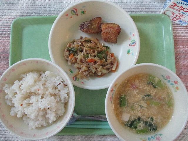 6月18日 牛乳 中華風炊き込みご飯 豚肉と野菜のオイスター炒め あべかわさつま芋(2個) 中華卵コーンスープ