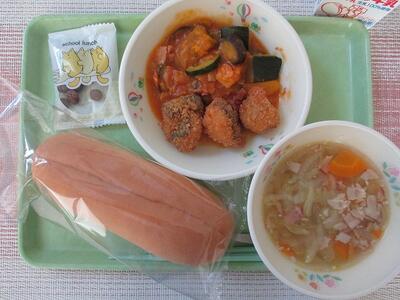 6月19日 牛乳 コッペパン(たてスライス) コロコロサーモンフライ 夏野菜のラタトゥイユ ABCマカロニ入りスープ 黒糖大豆