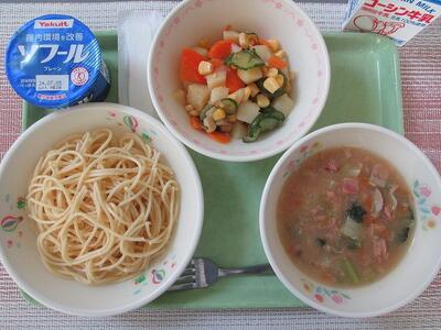6月20日 牛乳 ツナと江戸菜の和風スパゲティ(スパゲティ) みそドレッシングサラダ ヨーグルト